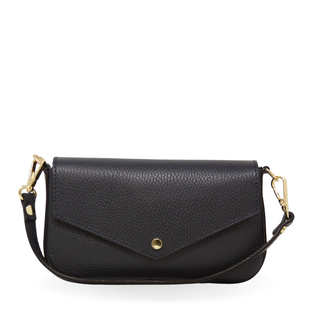 Black Genuine Italian Leather Handle and Crossbody Bag made of high-quality Italian leather. It features a convenient top leather handle and a long shoulder chain for easy transport of your phone and essentials, allowing for versatile wear as either a shoulder bag or crossbody. Measurements: 4'' H x 8'' W x 1 1/2'' D