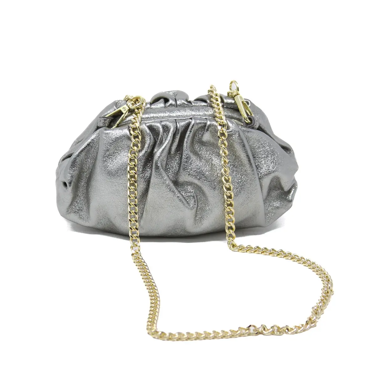 made of metallic Italian leather, with a shiny-looking surface with a soft touch. With a rectangular shape and subtle pleats that enhance its three-dimensional and modern look. The top has a magnetic closure and is accompanied by a metal chain. Measurements: 9''W x 5''H x 2''D