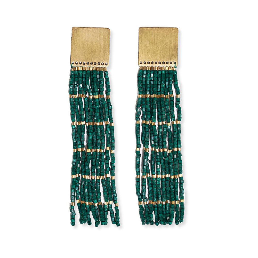 Harlow Emerald Brass Top Solid With Gold Stripe Beaded Fringe Earrings