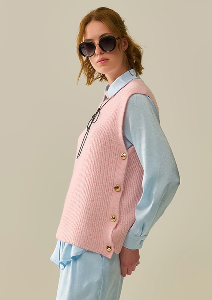 Pink sleeveless sweater with gold buttons
