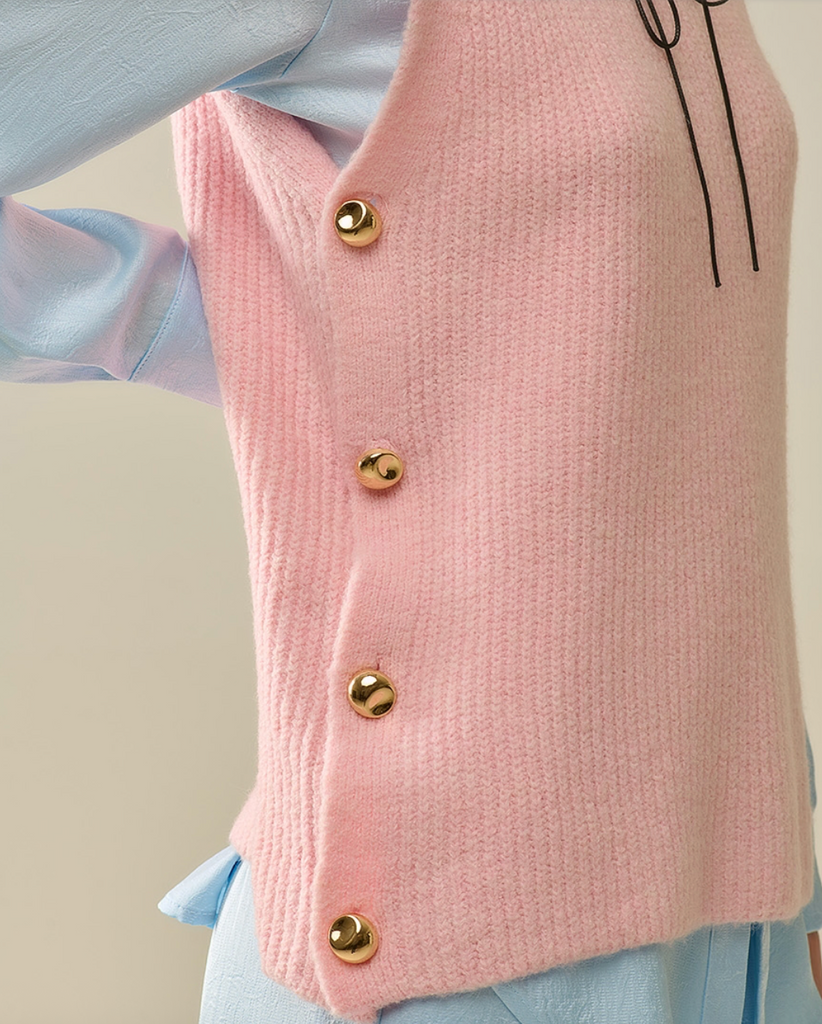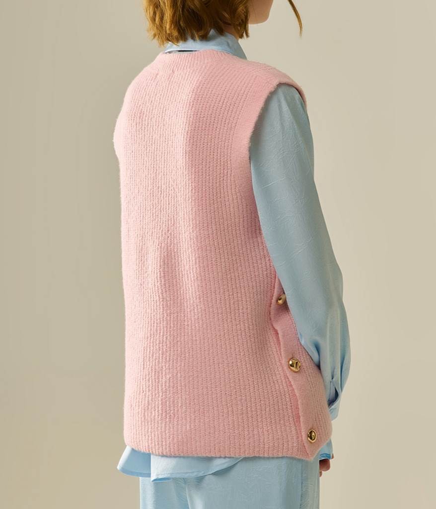 A stylish sleeveless sweater. beautifully accented with elegant gold buttons that add a touch of sophistication and flair. Perfect for layering or making a statement on its own. this piece combines comfort with a chic aesthetic. making it a versatile addition to any wardrobe.