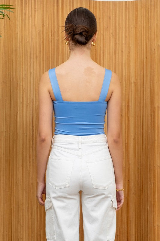 The Solid Square Neck Knit Top features a square neckline with sleeveless wide straps.