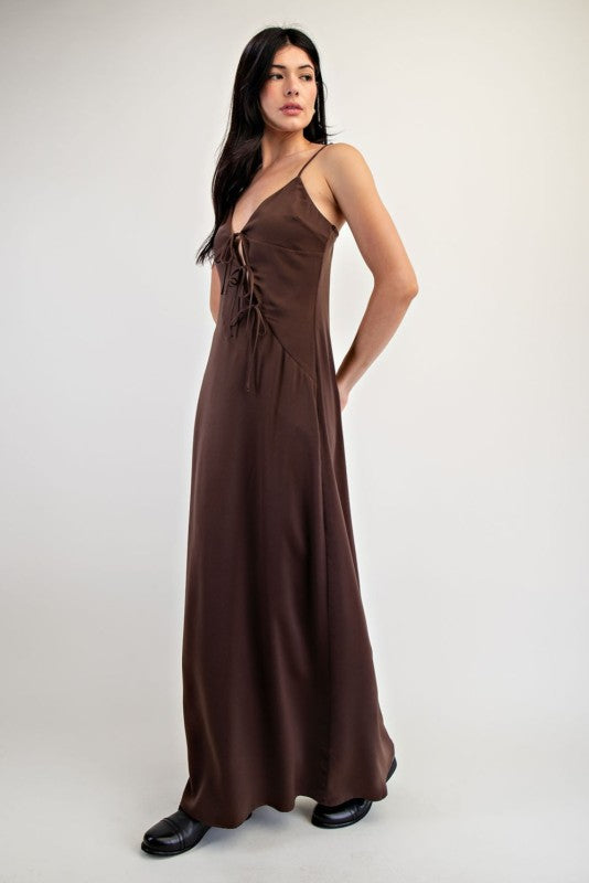 Brown Open Tie Satin Cami Dress - S is backordered and will ship as soon as it is back in stock.