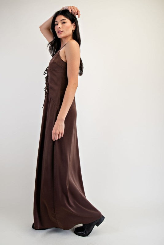 Brown Open Tie Satin Cami Dress