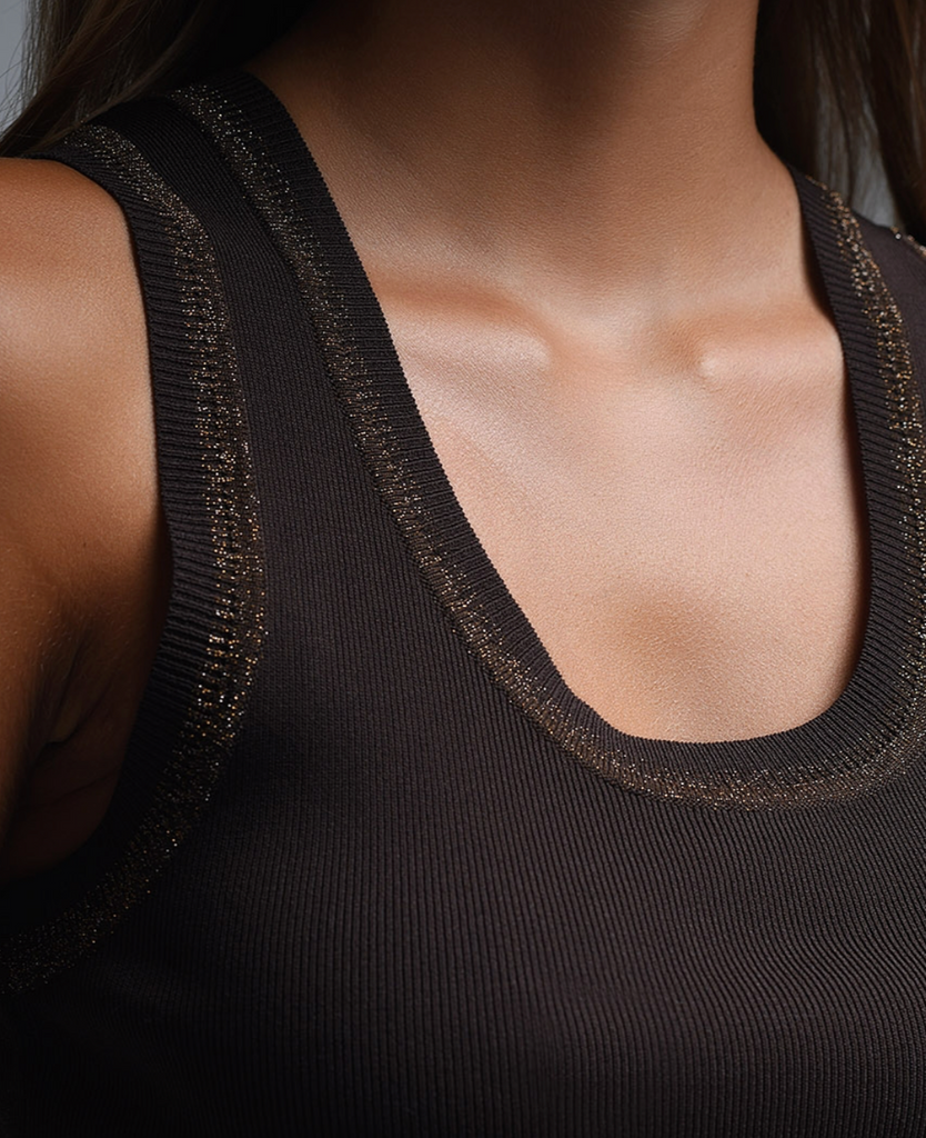 Elevate your wardrobe with this stunning fitted top that seamlessly combines style and comfort. Designed with a sleek sleeveless silhouette and a fashionable scoop neck this piece showcases a sophisticated ribbed knit fabric that beautifully hugs your curves. The eye-catching metallic details add a touch of glamour making it perfect for both casual outings and more refined occasions. Available in a rich chocolate brown hue this versatile top is sure to enhance any outfit providing a fresh pop of color that transitions effortlessly from day to night