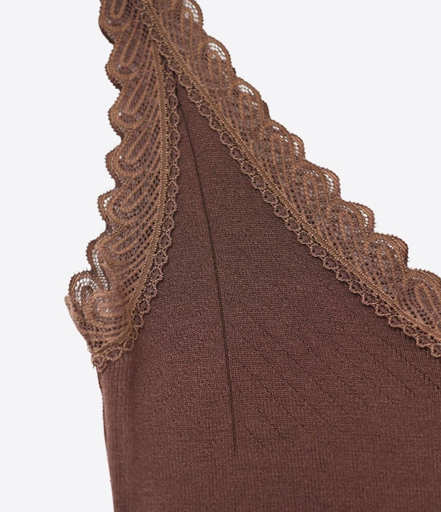 Introducing the Scoop Neck knitted Lace Trim Tank Top designed from high-quality chocolate brown ribbed knitted fabric that offers both softness and durability. This tank top features an elegant scoop neckline and delicate lace trimming around the edges adding a touch of femininity to your wardrobe. Perfect for layering or wearing on its own this versatile piece is ideal for any occasion whether you're dressing up for a night out or enjoying a casual day.