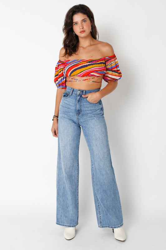 Our Dhanna Top features open shoulders and pull on style.  Multi color.