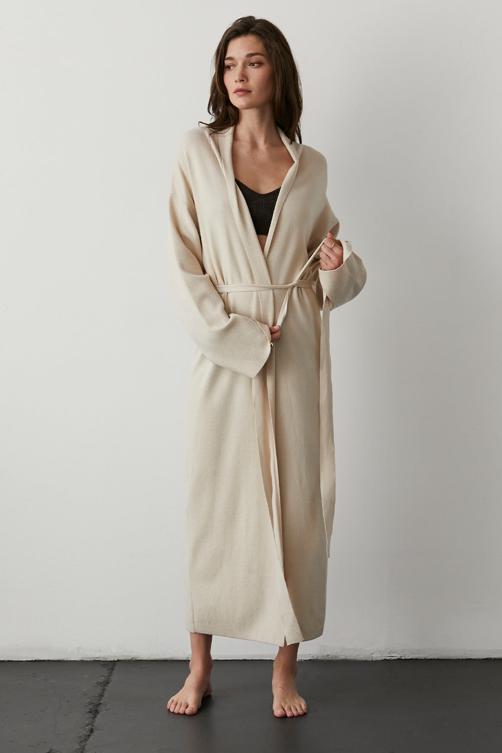 Made with a soft sweater knit, the Ezra Long Cardigan features long sleeves, drop shoulders, ribbed cuffs, clean cut hem, a removable self belt and slit details on the side. Throw it over the matching Adele Knit Top and Mavis Knit Lounge Pants for an ultimate luxe lounge look. Duster length.