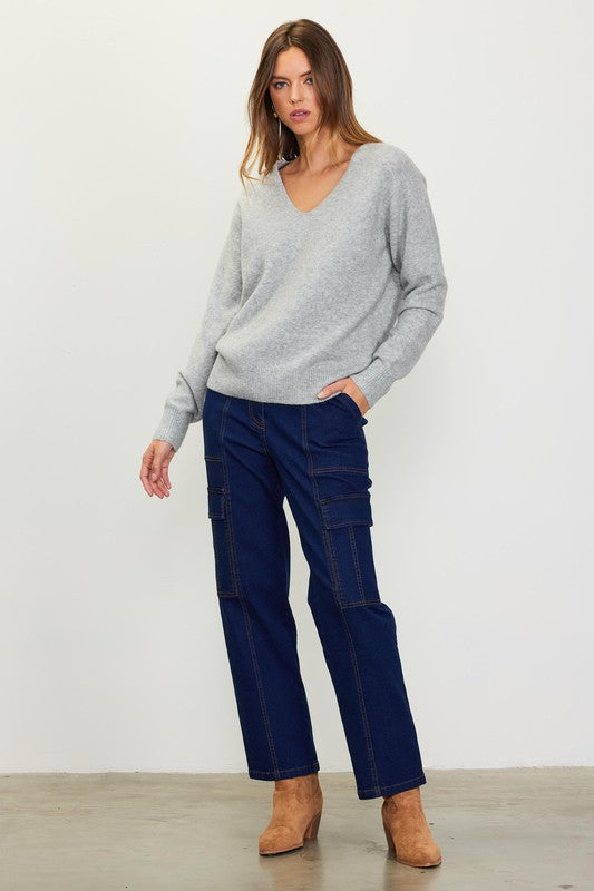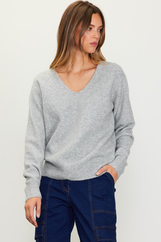 Grey Long Sleeve V Neck Classic Sweater