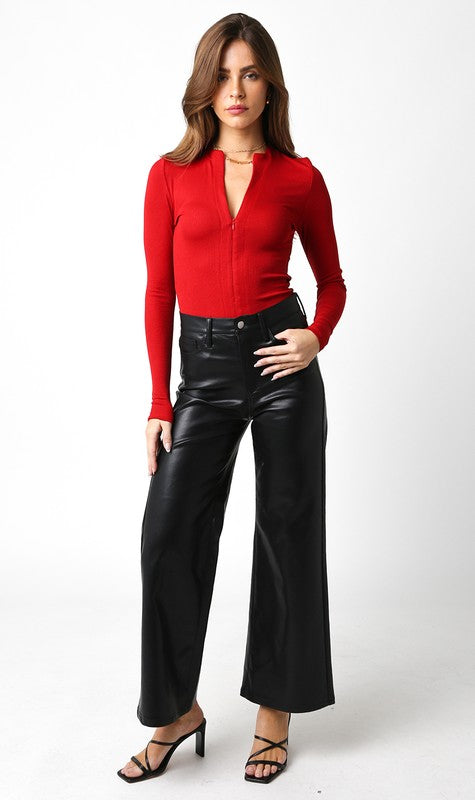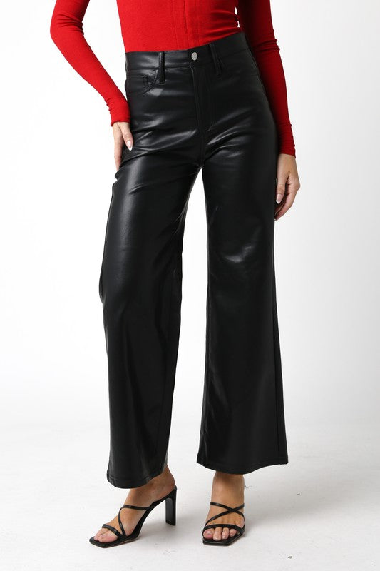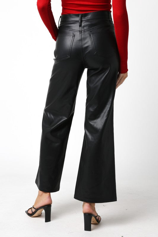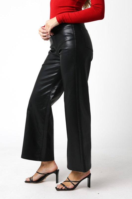 Our Jordin PU Vegan Pants features a button closure, ankle length and wide leg bottom.