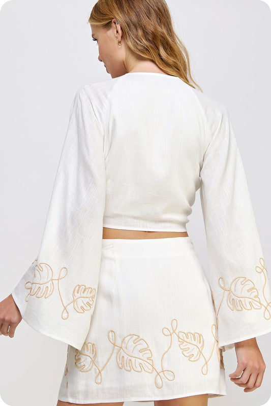 Off White Linen Front Tie Embroidered Top