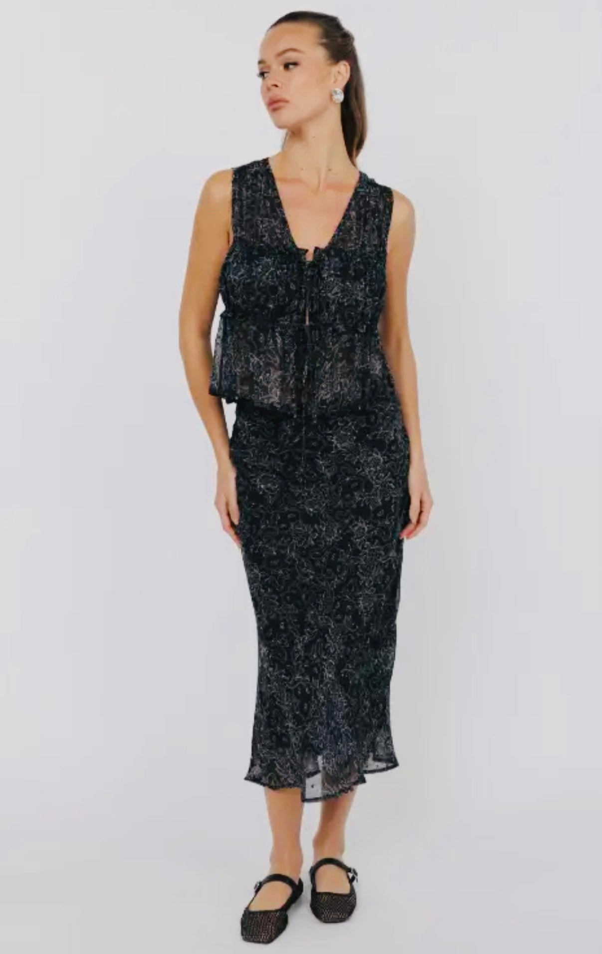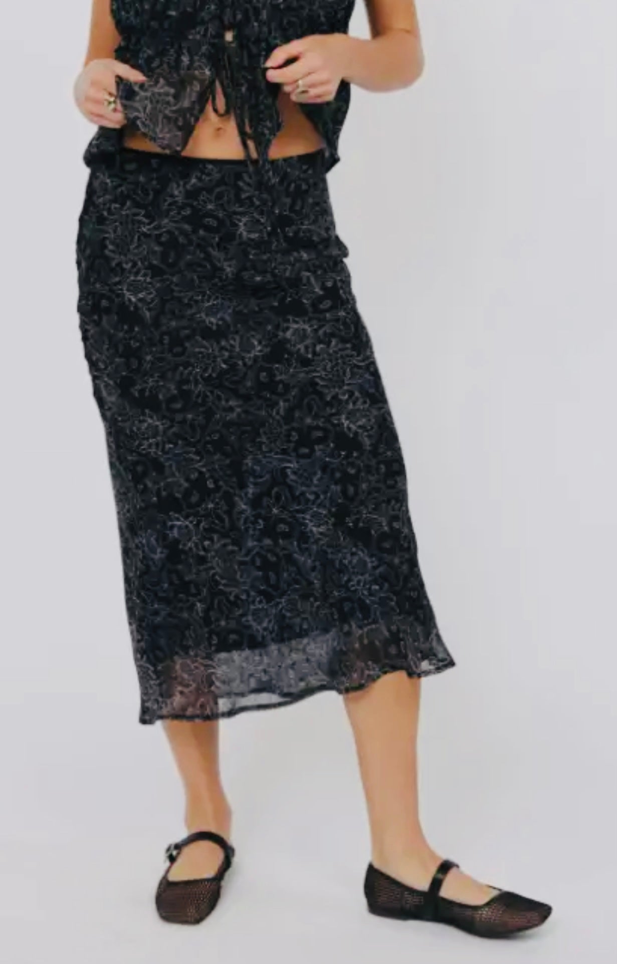 This black lace midi skirt brings effortless elegance to your wardrobe with its delicate floral embroidery and lightweight, semi-sheer overlay. Designed with a flattering high-rise fit and soft lining, it offers both comfort and style for any occasion. The flowy silhouette adds graceful movement, while the subtle shimmer in the fabric lends a touch of glam. Pair it with the matching lace top for a coordinated set, or dress it down with a simple tee and flats for chic everyday wear.