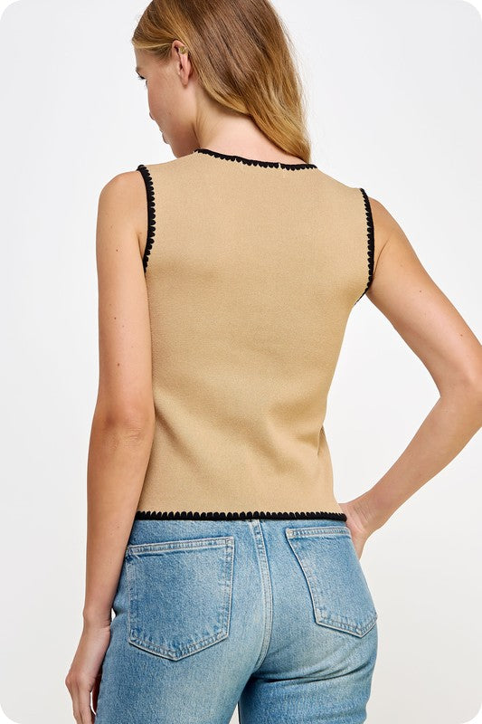 This versatile sleeveless top features embroidery detail at neckline/armhole/hem and a round neckline.