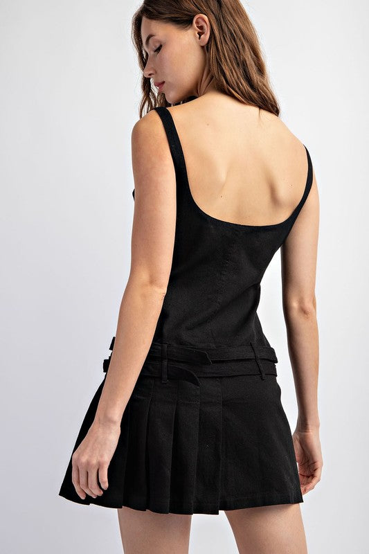 Structured, sleek, and undeniably chic. This mini dress features a square neckline with wide tank straps for a modern edge, while the fitted bodice and double-belt waist detail create a flattering, cinched silhouette. The pleated mini skirt adds playful movement, balanced by a daring low scoop back and hidden zipper closure. Effortlessly blending bold style with sophistication, it’s the perfect dress for a night out.