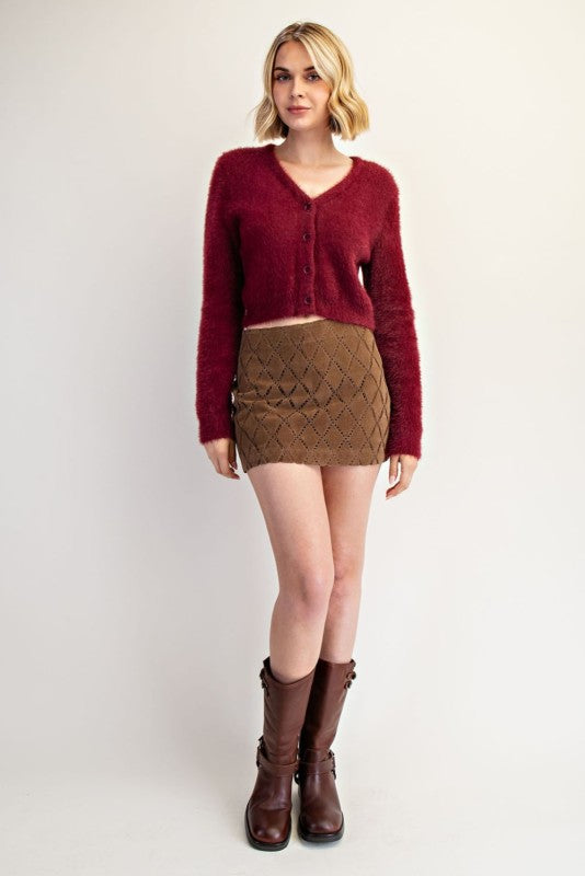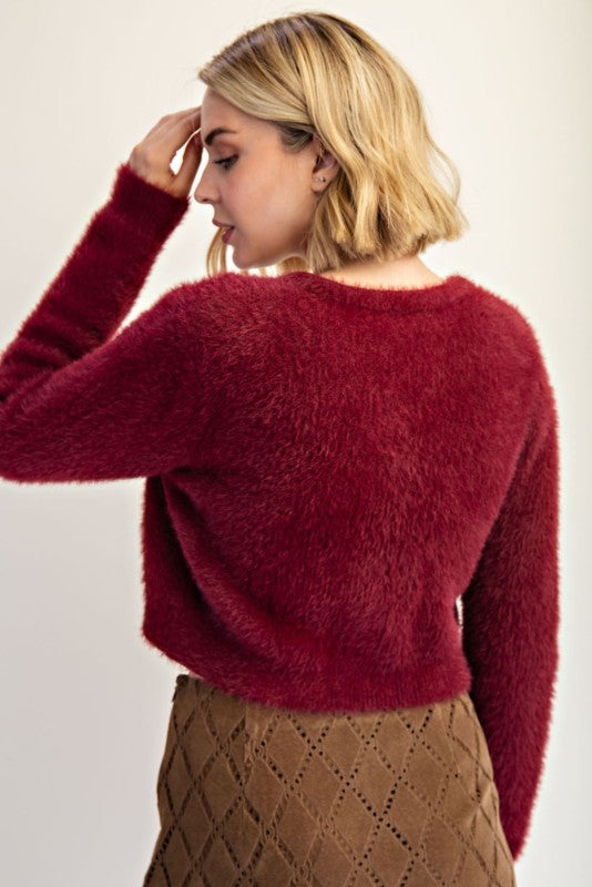 Wine Fuzzy Cropped Cardigan - L is backordered and will ship as soon as it is back in stock.